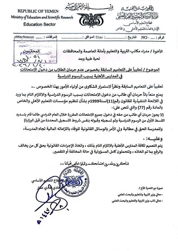 صنعاء: بسب شكاوى أولياء الأمور.. التربية تطلق إنذار صارم للمدارس الأهلية وتتوعد المخالفين (