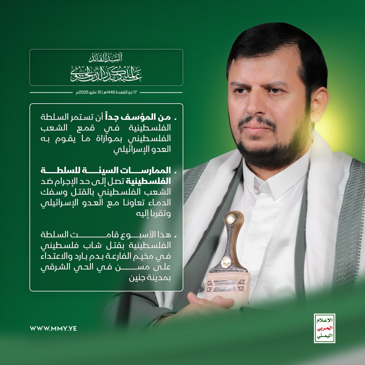 السيد عبد الملك بدر الدين الحوثي حول مستجدات العدوان على غزة وآخر التطورات الإقليمية والدولية - 17 ذو القعدة 1446هـ | 15 مايو 2025م: