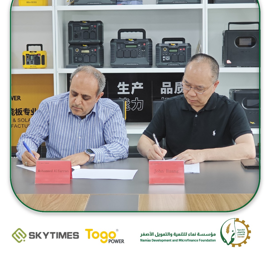 في إطار الشراكات المستمرة والتي تقوم مؤسسة نماء ببنائها مع شركاء من عدة دول وأيضاً استدامة للمؤسسة، تم توقيع اتفاقية وكالة حصرية مع شركة Skytimes، المالكة للعلامة التجارية Togo Power، الرائدة في إنتاج محطات الطاقة المحمولة والمولدات الشمسية الذكية.