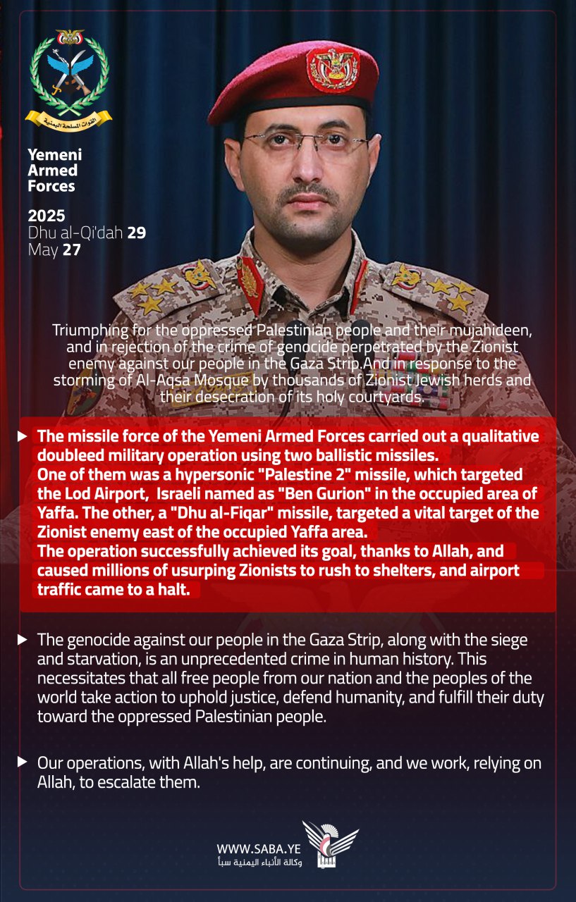 نفذتِ القوةُ الصاروخيةُ في القواتِ المسلحةِ اليمنيةِ عمليةً عسكريةً نوعيةً مزدوجةً وذلك بصاروخينِ بالستيينِ أحدُهما فرطُ صوتيٍّ نوعُ "فلسطين2" استهدفَ مطارَ اللدِّ المسمى إسرائيلياً مطارُ "بن غوريون" في منطقةِ يافا المحتلةِ، والآخرُ نوعُ "ذو الفقار" استهدفَ هدفاً حيوياً للعدوِّ الصهيونيِّ شرقيَّ منطقةِ يافا المحتلة، وقد حققَتِ العمليةُ هدفَهُا بنجاحٍ بفضلِ اللهِ، وتسببَت في هروعِ ملايينِ الصهاينةِ الغاصبينِ إلى الملاجئِ، وتوقفِ حركةِ المطارِ.