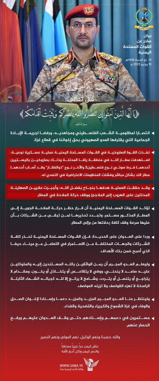 بيان القوات المسلحة اليمنية بشأن استهداف مطار اللد "بن غوريون" في منطقة يافا المحتلة بصاروخينِ باليستيين أحدُهما فرطُ صوتي نوعُ فلسطين٢ والآخر نوع ذوالفقار - 10 يونيو 2025م
