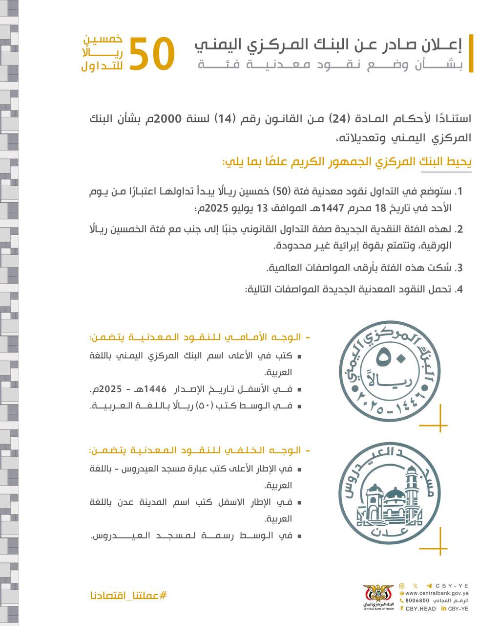 إعلان صادر عن البنك المركزي اليمني بصنعاء بشأن وضع نقود معدنية فئة (50) خمسين ريالًا للتداول