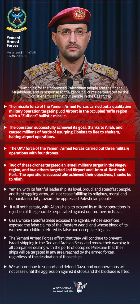 نفذتِ القوةُ الصاروخيةُ في القواتِ المسلحةِ اليمنيةِ عمليةً عسكريةً نوعيةً استهدفتْ مطارَ اللُّدِ في منطقةِ يافا المحتلةِ وذلك بصاروخٍ باليستيٍّ نوع "ذوالفقار"، وقد حققَتِ العمليةُ هدفَهُا بنجاحٍ بفضلِ اللهِ، وتسببَت في هروبِ الملايينِ من قُطعانِ الصهاينةِ الغاصبينَ إلى الملاجئِ، وتوقفِ حركةِ المطارِ.
