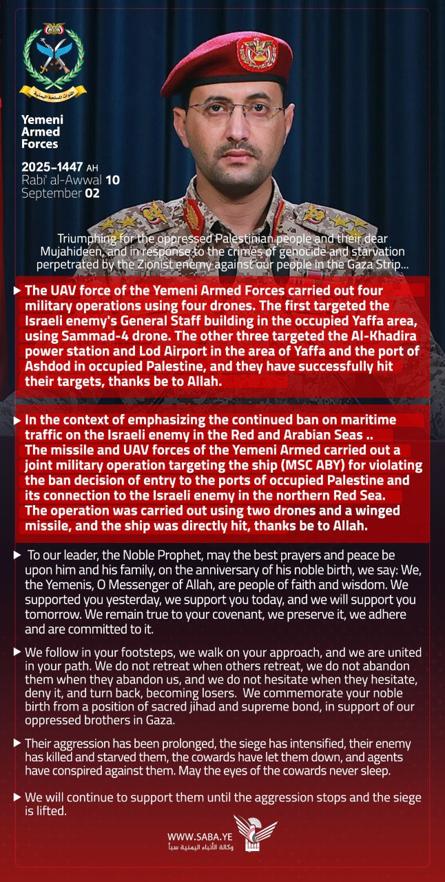 نَفَّذَ سلاحُ الجوِّ المسيَّرُ في القوّاتِ المسلَّحةِ اليمنيَّةِ أربعَ عمليّاتٍ عسكريّةً، بأربعِ طائراتٍ مسيّرةٍ، استهدفتِ الأولى مبنى هيئةِ الأركانِ التابعةِ للعدوِّ الإسرائيليِّ في منطقةِ يافا المحتلّةِ، وذلكَ بطائرةٍ مسيّرةٍ نوعَ صمّاد٤، فيما الثلاثُ الأخرى استهدفتْ محطةَ كهرباءَ الخضيرةَ، ومطارَ اللّدِّ في يافا، وميناءَ أسدودَ بفلسطينَ المحتلّةِ، وقد أصابتْ أهدافَها بنجاحٍ بفضلِ اللهِ.