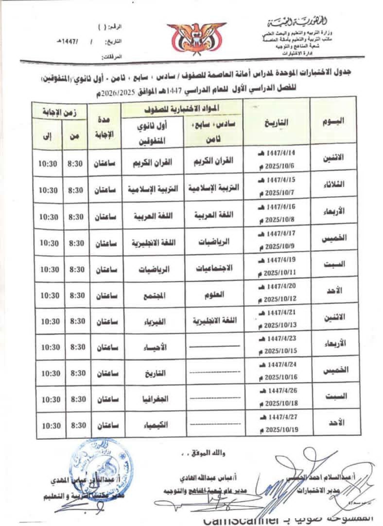 تربية أمانة العاصمة | *جدول الاختبارات المركزية الموحدة للصفوف السادس والسابع والثامن بمدارس أمانة العاصمة، إضافةً إلى صف أول ثانوي لشعب المتفوقين فقط في مدارس البناء النموذجي الحكومية..* للفصل الدراسي الأول للعام ١٤٤٧ﮪ ـ ٢٠٢٦/٢٠٢٥م.