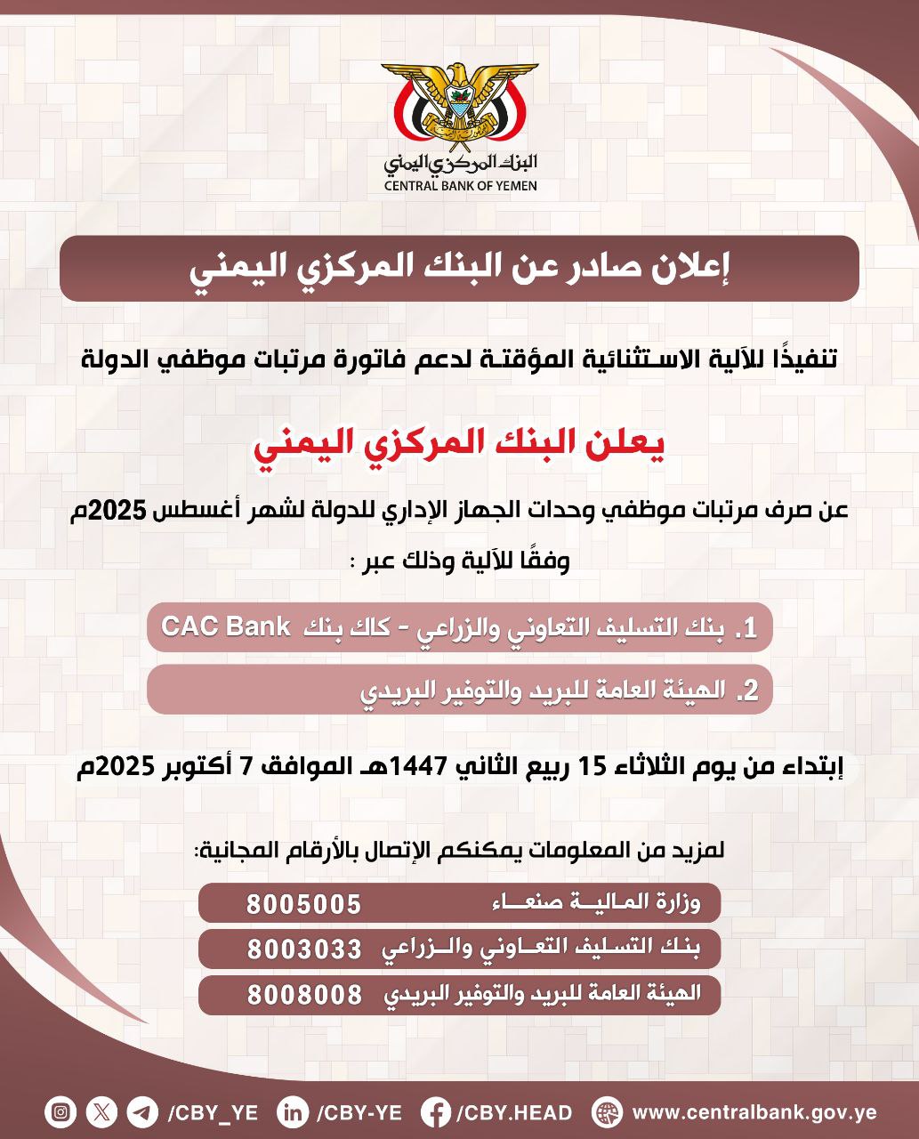 يعلن البنك المركزي اليمني عن صرف مرتبات موظفي وحدات الجهاز الإداري للدولة لشهر اغسطس 2025م وفقاً للآلية وذلك عبر: