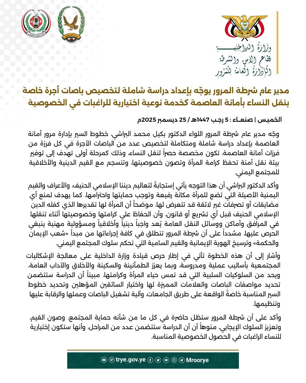 وجّه مدير عام شرطة المرور اللواء الدكتور بكيل محمد البراشي، خطوط السير بإدارة مرور أمانة العاصمة بإعداد دراسة شاملة ومتكاملة لتخصيص عدد من الباصات الأجرة في كل فرزة من فرزات أمانة العاصمة، تكون مخصصة حصراً لنقل النساء، وذلك كمرحلة أولى تهدف إلى توفير بيئة نقل آمنة تحفظ كرامة المرأة وتصون خصوصيتها، وتنسجم مع القيم الدينية والأخلاقية للمجتمع اليمني.