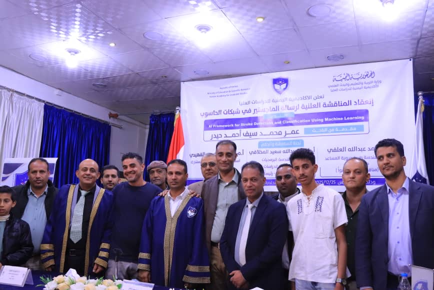 حصل الباحث المهندس/ عمر محمد سيف احمد حيدر على درجة الماجستير بامتياز من الأكاديمية اليمنية للدراسات العليا في شبكات الحاسوب عن رسالته الموسومة "استخدام تقنيات الذكاء الصناعي في تشخيص الجلطات الدماغية".
