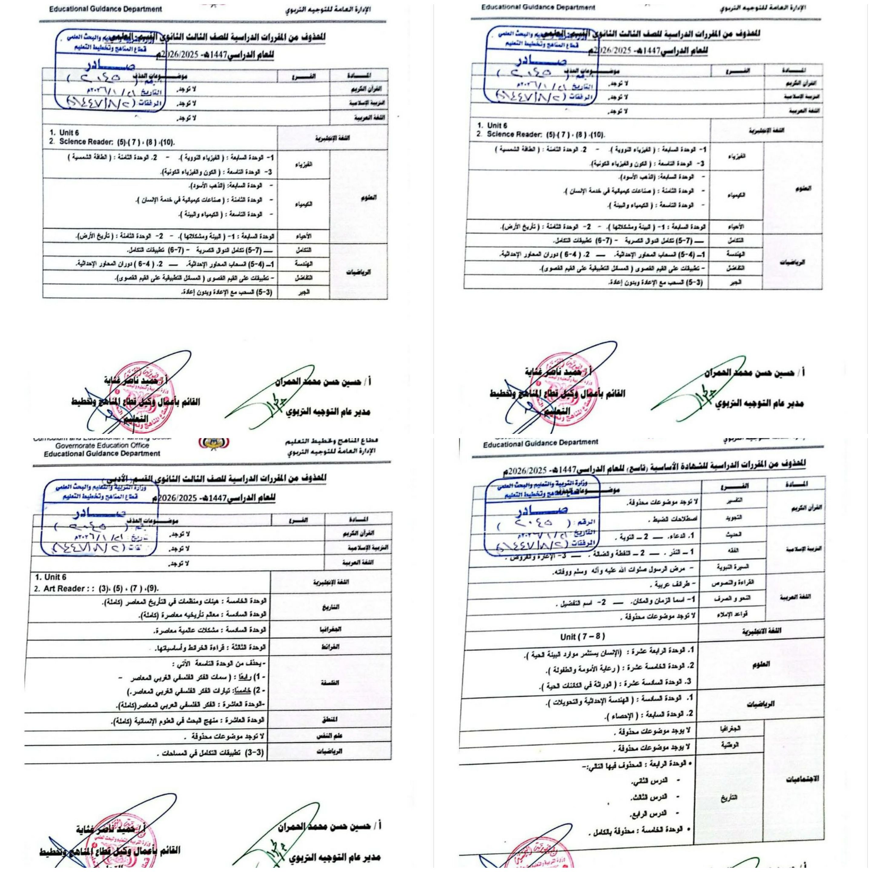 شاهد صور المحذوفات للعام 2025. - 2026 م للشهادتين الأساسية والثانوية