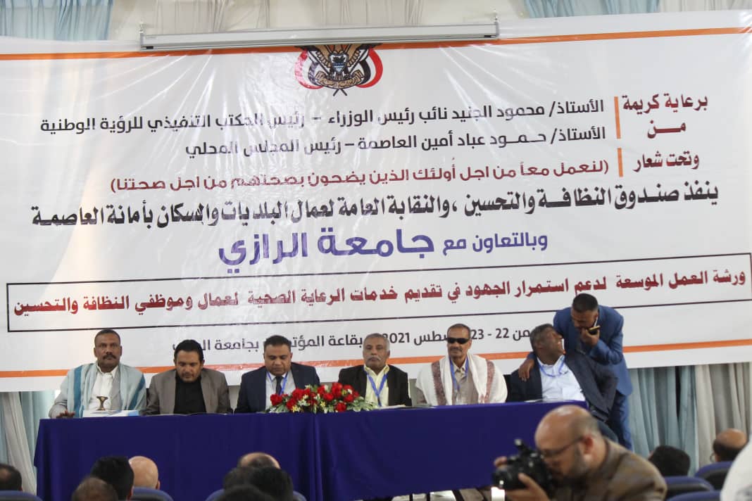 بدأت اليوم ورشة عمل لدعم تقديم خدمات الرعاية الصحية لعمال وموظفي النظافة بأمانة العاصمة، ينظمها صندوق النظافة والتحسين والنقابة العامة لعمال البلديات بالأمانة بالتعاون مع جامعة الرازي.