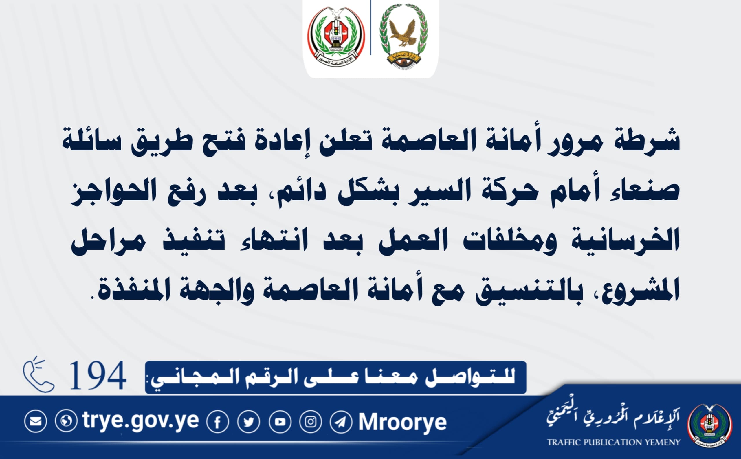 أعلنت شرطة مرور_امانة_العاصمة صنعاء ، اليوم، إعادة فتح طريق السائلة أمام حركة السير، بعد استكمال تنفيذ مشروع تأهيل الخط الرئيسي الناقل للصرف الصحي.