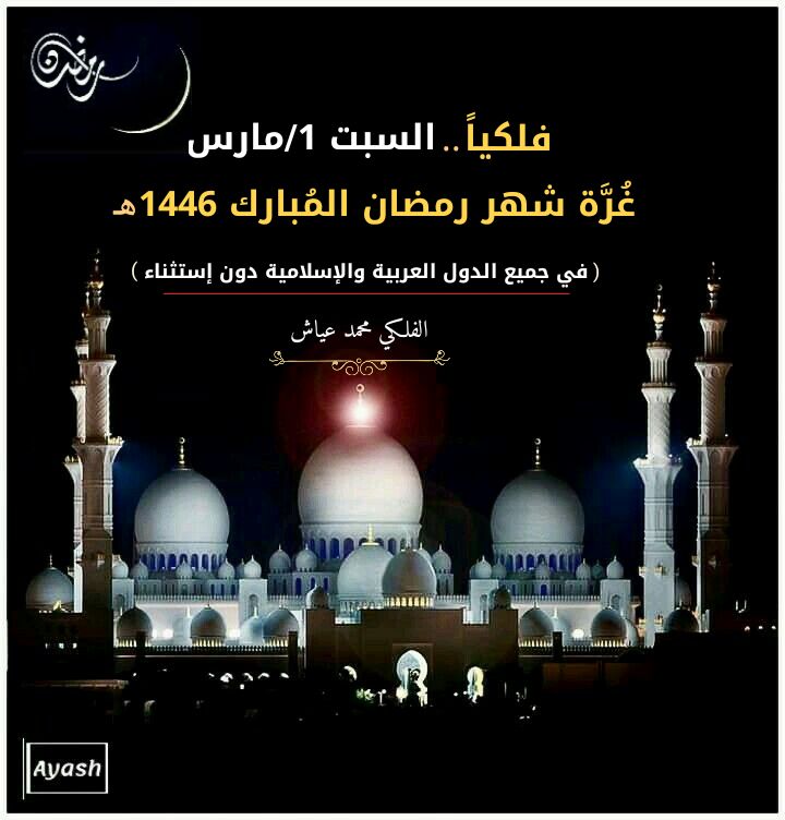 الفلكي: محمد عياش: تحري هلال رمضان مع يوم الجمعه الموافق لـ29 من شعبان ـ الـ28 من فبراير ـ وفليكاً يكون السبت الأول من مارس.. أول أيام شهر رمضان المُبارك 1446هـ، وذلك في كل الدول العربية والإسلامية دون إستثناء، إن شاء الله