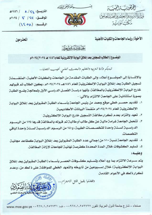 شاهد: صنعاء | تعميم وزاري بشأن الطلاب المسجلين بعد اغلاق البوابة الإلكترونية للعام الجامعي ١٤٤٦ﮪ ـ ٢٠٢٥/٢٠٢٤م.