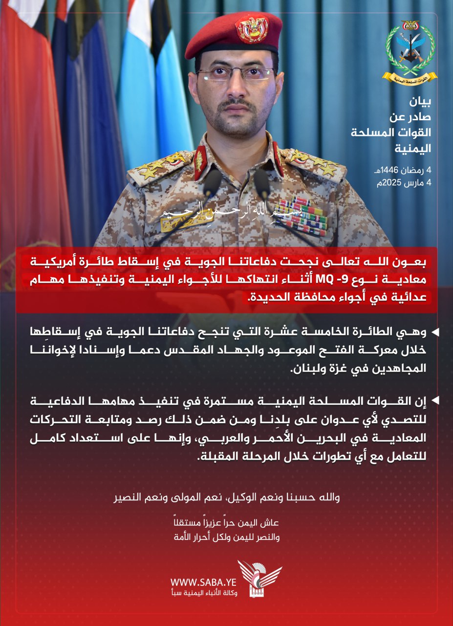 بعون الله تعالى نجحت دفاعاتنا الجوية في إسقاط طائرة أمريكية معادية نوع MQ_9 أثناء انتهاكها للأجواء اليمنية وتنفيذها مهام عدائية في أجواء محافظة الحديدة.