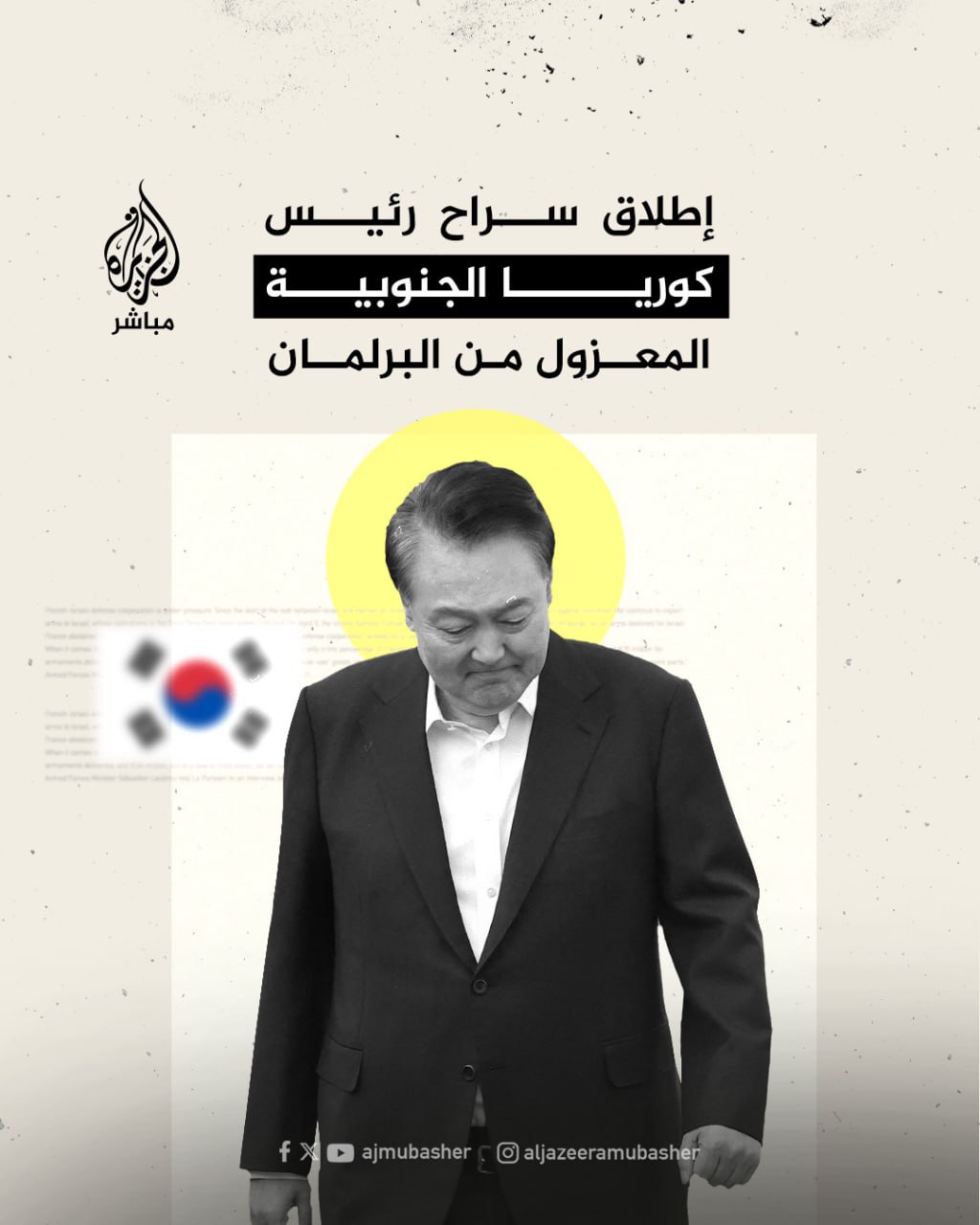 إطلاق سراح يون سوك يول رئيس كوريا_الجنوبية المعزول من البرلمان بعد قرار النيابة العامة عدم الاستئناف على قرار المحكمة المركزية في سول بالإفراج عنه.