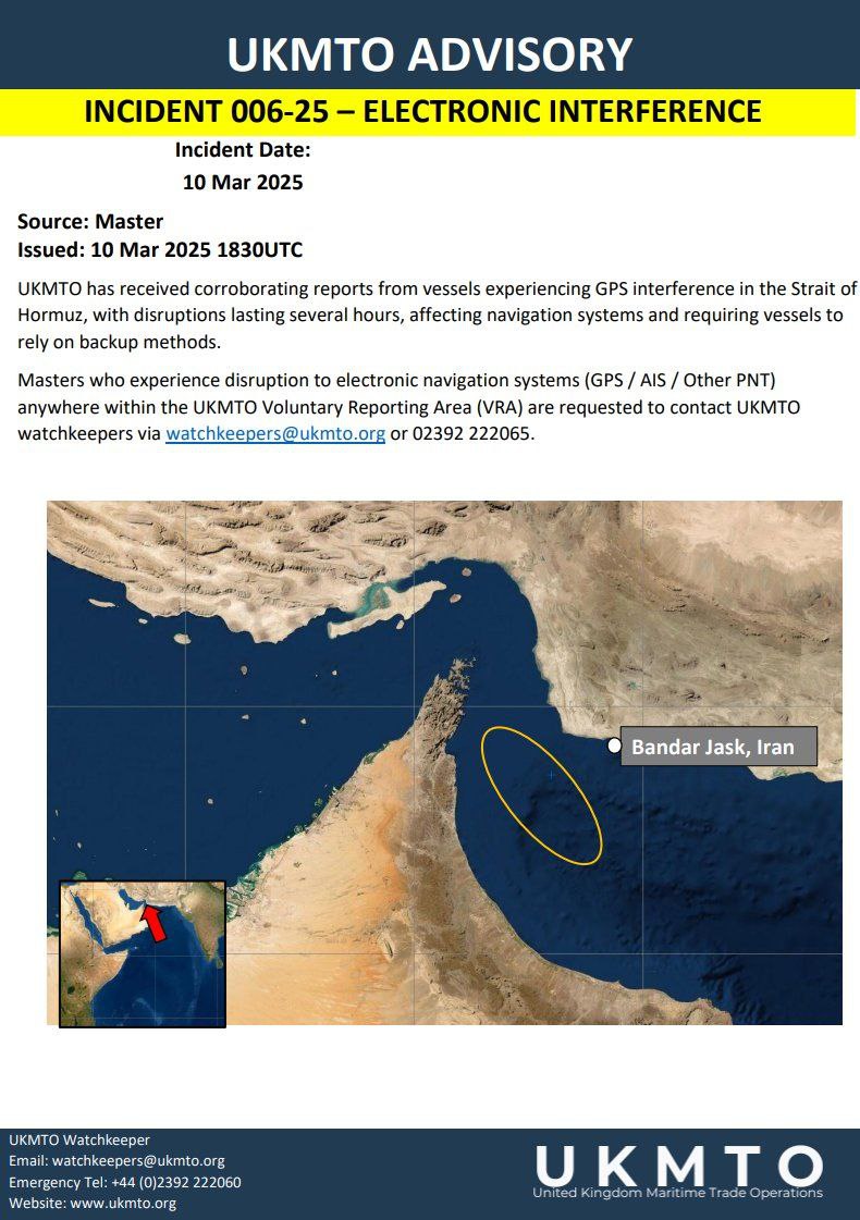هيئة التجارة البحرية البريطانية تتلقى بلاغات عن تداخل الكتروني في أنظمة الملاحة البحرية لعدد من السفن في مضيق هرمز.