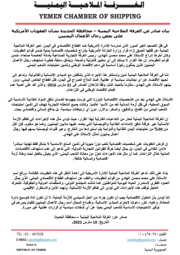 وطالبت الغرفة الملاحية اليمنية بإعادة النظر في هذه العقوبات الظالمة، ورفع اسم علي محمد محسن الهادي من قوائم العقوبات والكف عن استهداف القطاع الاقتصادي اليمني الذي يمثل العمود الفقري لاستمرار الحياة اليومية للمواطنين.